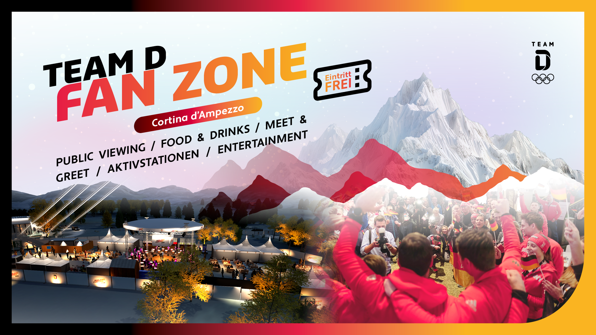 Eine Team D Fan Zone wird es auch in Cortina wieder geben - dieses Mal eintrittsfrei, direkt vor dem Deutschen Haus und erreichbar via Shuttle aus dem Ortszentrum. Fans aus aller Welt erwartet Hüttenflair, Public Viewing, kulinarische Angebote und Mitmach-Aktionen wie Eishockey, Biathlon und Eisstockschießen. Unter dem Dach des Deutschen Hauses sorgt zudem das traditionsreiche Kufenstüberl der Bob- und Schlittenfamilie für bayerisches Flair und gemütliche Atmosphäre. Bei den Paralympics öffnet dann das Österreich-Haus erneut als offizieller Treffpunkt des Österreichischen Paralympischen Committees (ÖPC) im Deutschen Haus seine Türen. Damit setzen wir auch zu den Winterspielen auf gelebte Gastlichkeit, Gemeinschaft und Nähe – ganz im Sinne des „Home of Team Deutschland“.